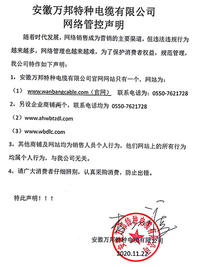 鄭重聲明:安徽萬邦特種電纜有限公司官方網站為:www_wanbangcable_com.u0256m.com.cn,除此之外無任何子網站或合作網站,其余均為假冒偽劣。電話:0550-7621728 13485756353 地 址:安徽省天長市滁州高新技術產業開發區經四路29號